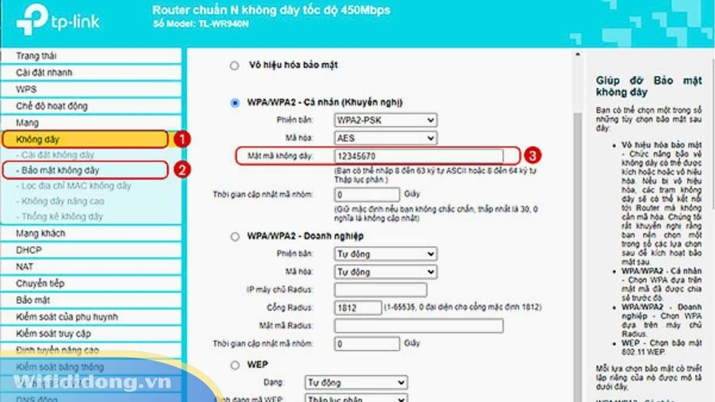 + Trong phần WPA/WPA2 – Personal (Recommended) hoặc WPA2-PSK/WPA-PSK, tìm trường Wireless Password (Mật khẩu không dây), Password, hoặc PSK Password.