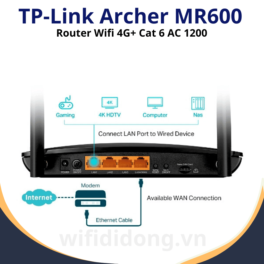 Router TP-Link Archer MR600 sở hữu cổng Full Gigabit Ethernet, cung cấp tốc độ nhanh chóng và ổn định cho các thiết bị có dây như TV thông minh, máy chơi game hay hệ thống NAS. Điểm nổi bật của sản phẩm là cổng WAN đa năng, tương thích hoàn hảo với modem cáp, cáp quang và DSL, mang đến sự linh hoạt tối ưu trong mọi hoàn cảnh. Đặc biệt, chế độ router không dây cho phép sử dụng kết nối 3G/4G như một giải pháp dự phòng, đảm bảo mạng Internet luôn liền mạch và không gián đoạn.