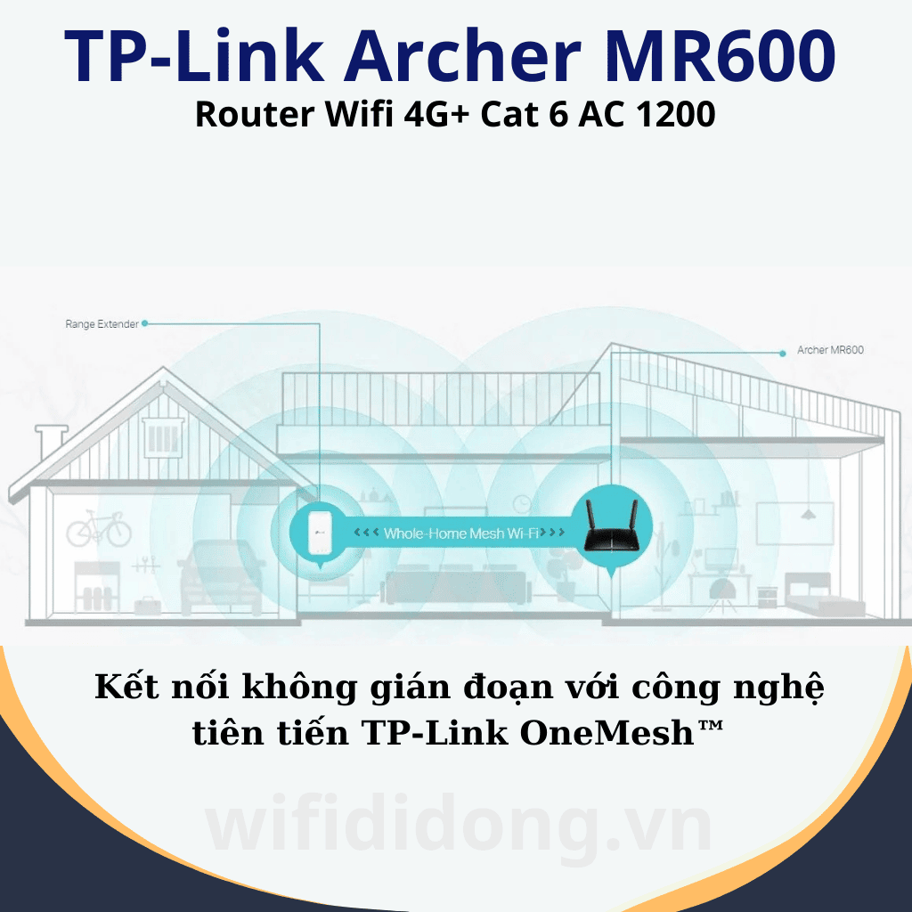 Router Wifi 4G+ Cat 6 AC 1200 TP-Link Archer MR600 mang đến trải nghiệm kết nối không gián đoạn với công nghệ tiên tiến TP-Link OneMesh™. Hệ thống này giúp hợp nhất toàn bộ mạng WiFi trong ngôi nhà chỉ với một tên duy nhất, cho phép bạn di chuyển thoải mái giữa các phòng mà không lo mất tín hiệu. Với Archer MR600, sự ổn định và mượt mà trong từng giây kết nối sẽ luôn đồng hành cùng bạn, dù ở bất kỳ đâu trong không gian sống.